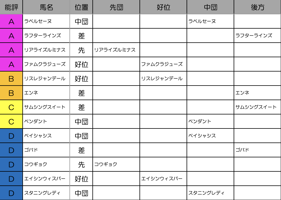 これを見れば縦比較で走破時計やレースラップがどれくらい優秀なのか把握できますし、予想の際にこれを見ればどの馬が強いレースを戦ってきたのかが一目瞭然です。