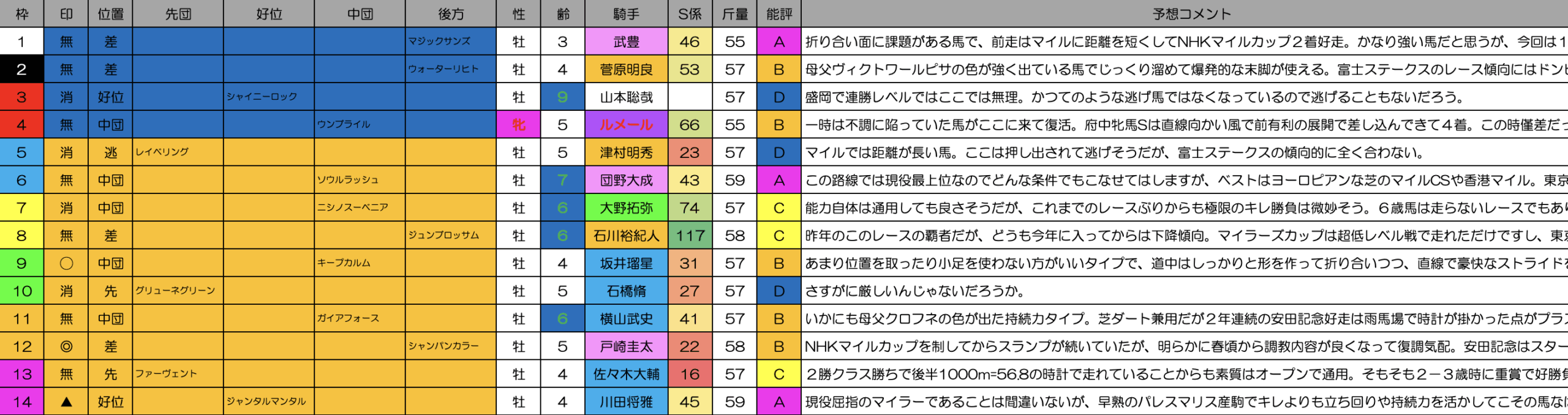 メンバーレベルは高いが、ジャンタルマンタルとソウルラッシュ、ガイアフォースは極限のキレ勝負は苦手そうで、マジックサンズは鬼門の1枠。これならダブル本命の2頭が頭まで突き抜けていいんじゃないだろうか。