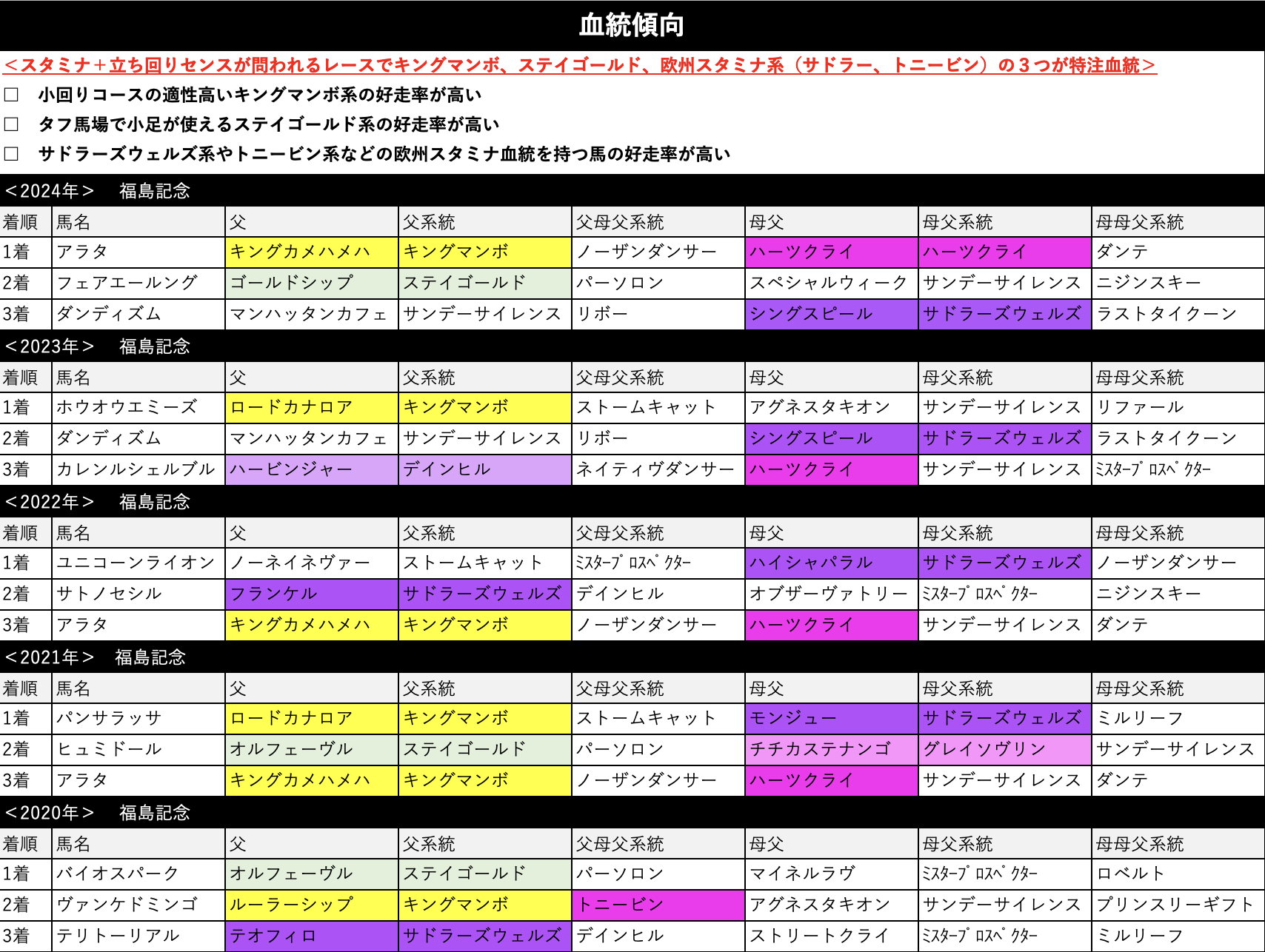 小回りコースの福島競馬場だけに前半〜中盤ラップが緩まないのが特徴。過去5年のラップ平均を見ても2秒近い前傾ラップになっていますし、最後は上がりが掛かってスタミナタイプの差し馬が台頭するレースです。