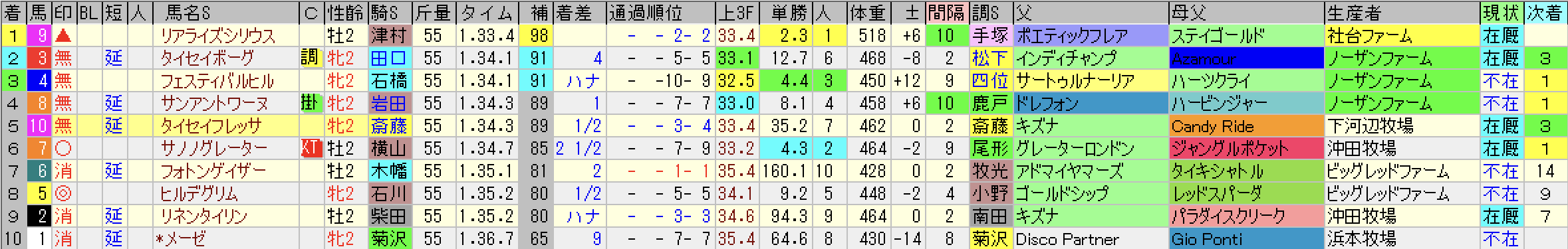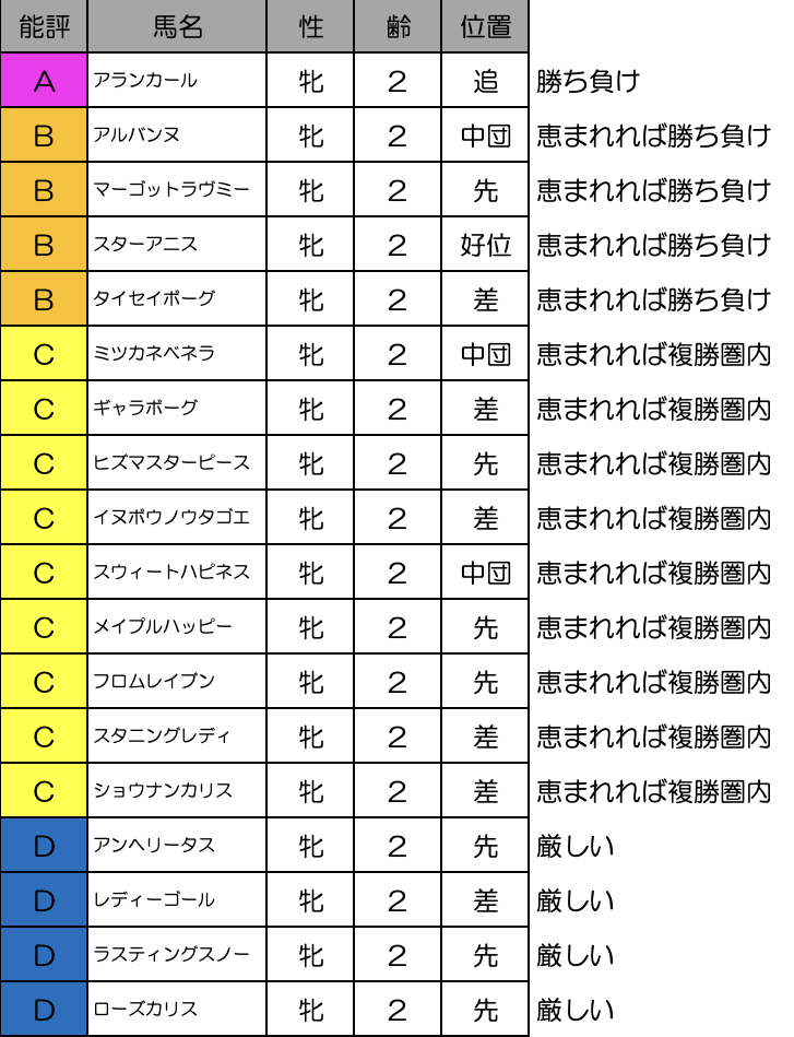 今年は重賞勝ちの馬が不在で、重賞で馬券圏内に走っているのもスターアニス、ミツカネベネラ、タイセイボーグの3頭だけ。おそらくアランカールはこの世代の牝馬でも最上位級だと思いますが、明らかに適性は中距離向きの馬に見えますし、そうなるとマイル路線で抜けたパフォーマンスをしている馬は不在。素質馬が今回で一気にパフォーマンスを上げてくることがなければ大波乱まであっていいんじゃないでしょうか。