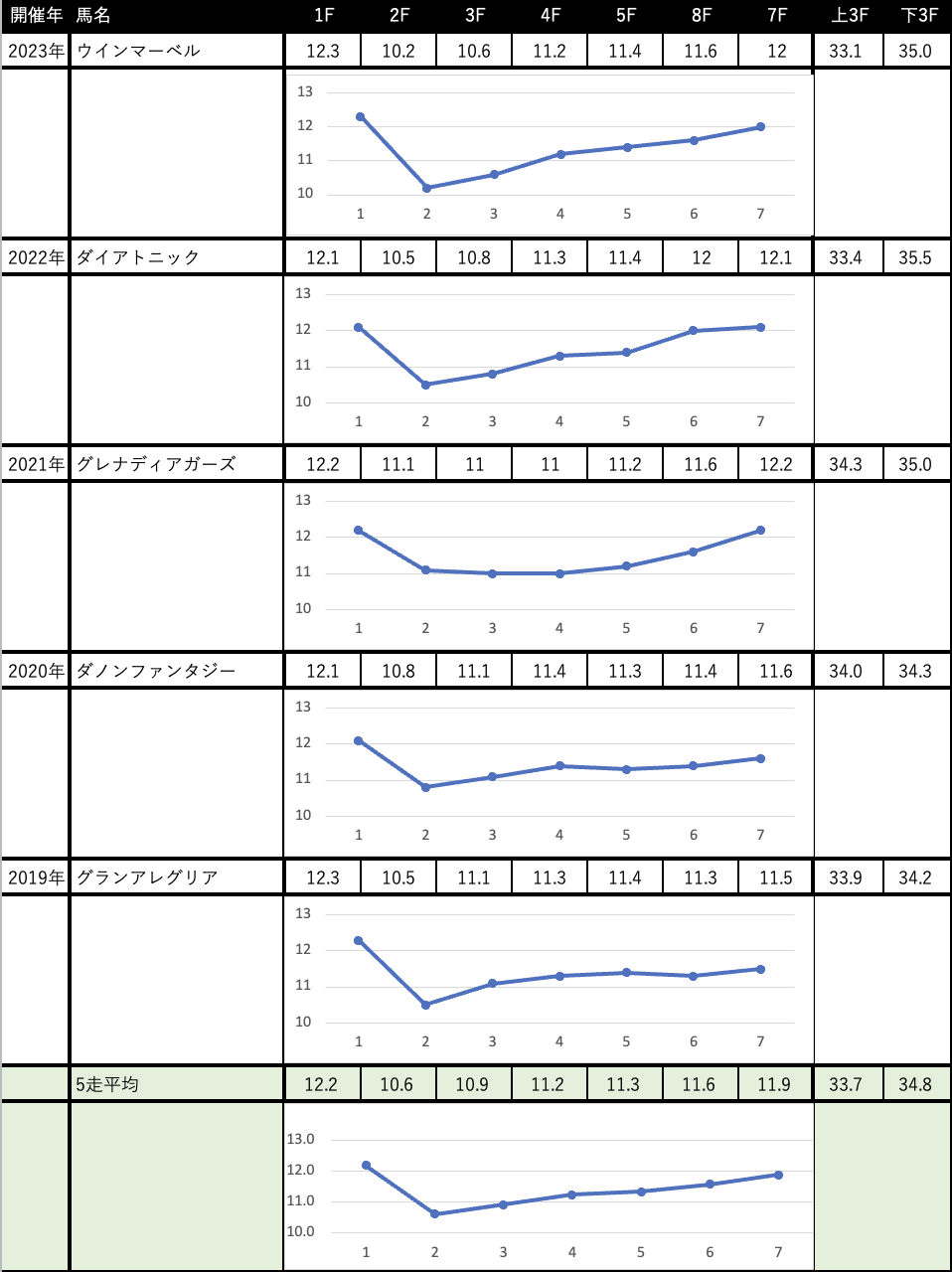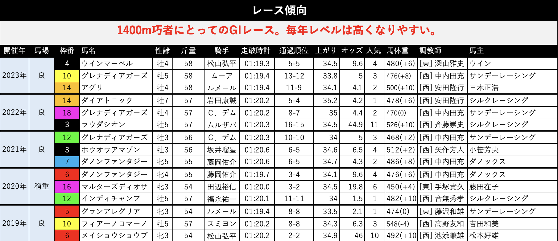 阪神芝1400mは最初のコーナーまでの距離が長いためにテンのスピードは速くなる舞台。過去5年のレースラップを見ても前半3ハロンは34秒前後で推移していますし、基本的には速い流れになるレースと見ていいでしょう。