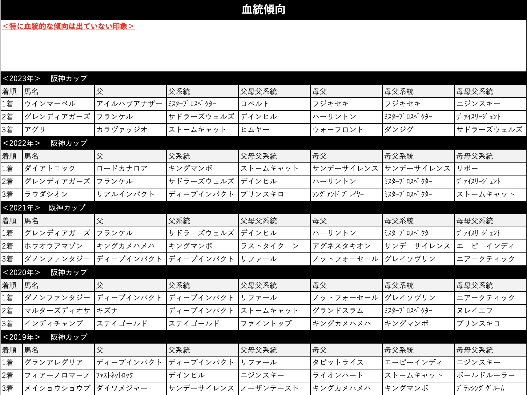 最近の阪神開催のレース結果を見ても、特に血統的な傾向は出ていない印象です。
