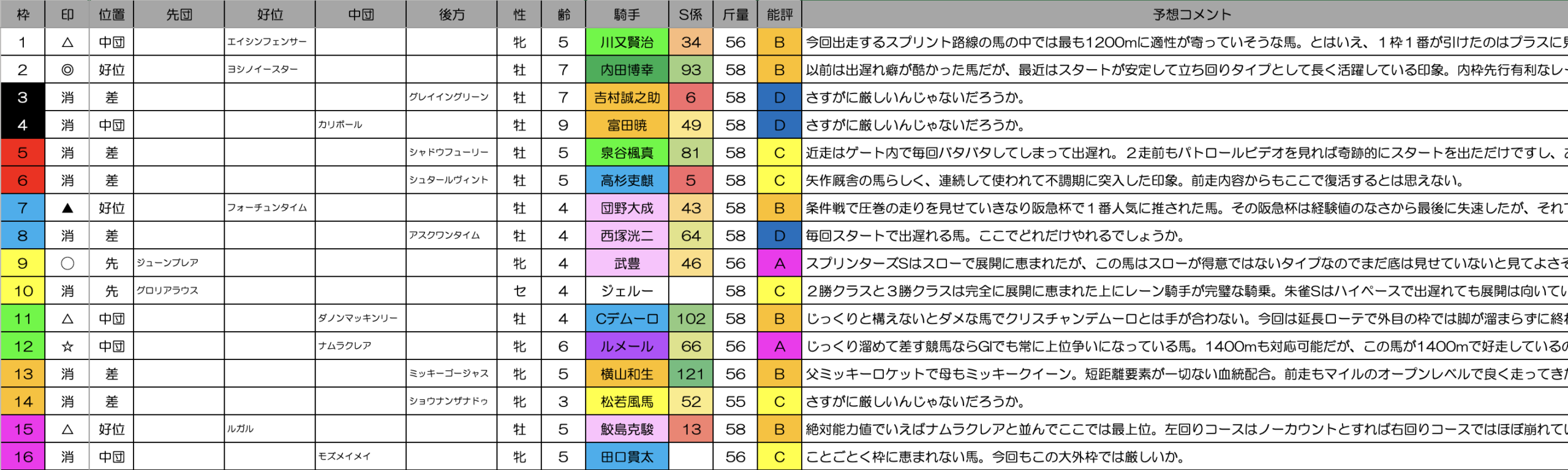 今回出走するスプリント路線の馬の中では最も1200mに適性が寄っていそうな馬。とはいえ、1枠1番が引けたのはプラスに見えますし、長期休養明けを叩いた上積みあってこの枠からスムーズな競馬ができれば好走あってもいいか。