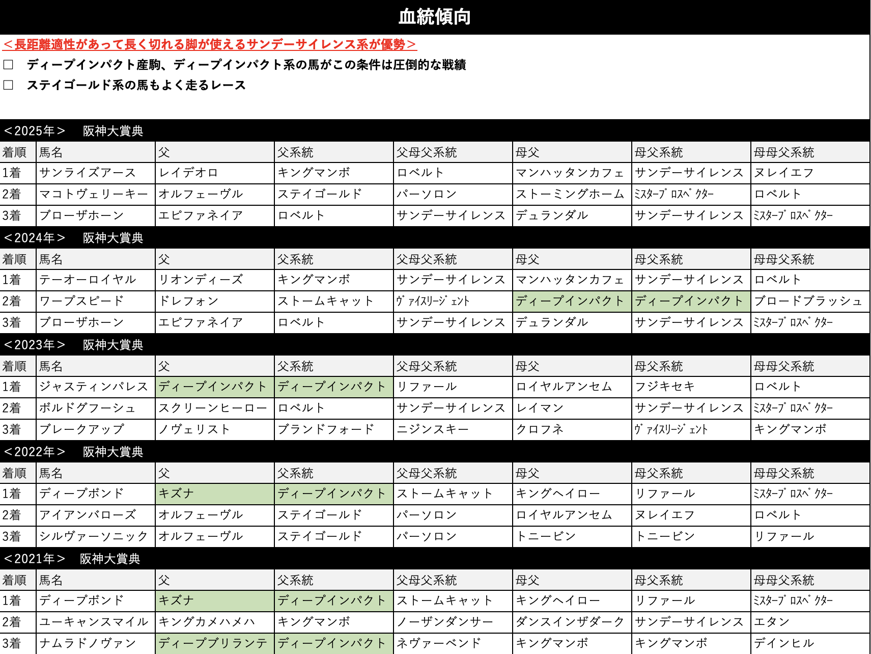 長距離適性があって長くキレる脚を使える馬が有利なレース。その筆頭とも言えるディープインパクト系やステイゴールド系の成績が非常に優秀となっています。
