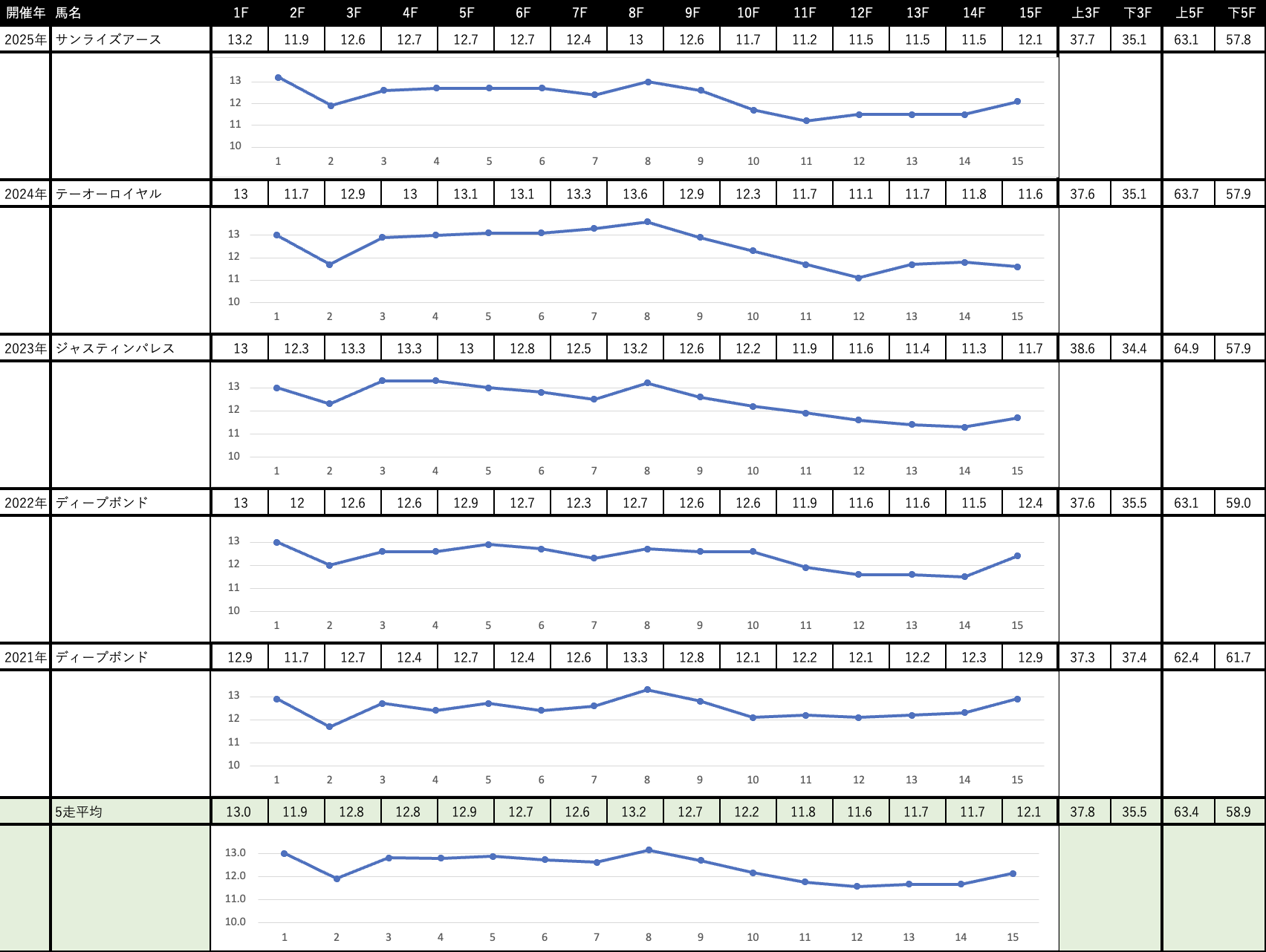 JRAでも屈指の長距離戦になるため、前半から速いペースになることは稀。過去5年の平均ラップで見ても前半1000m=63.4ですし、まず速いペースになることは考えづらい。