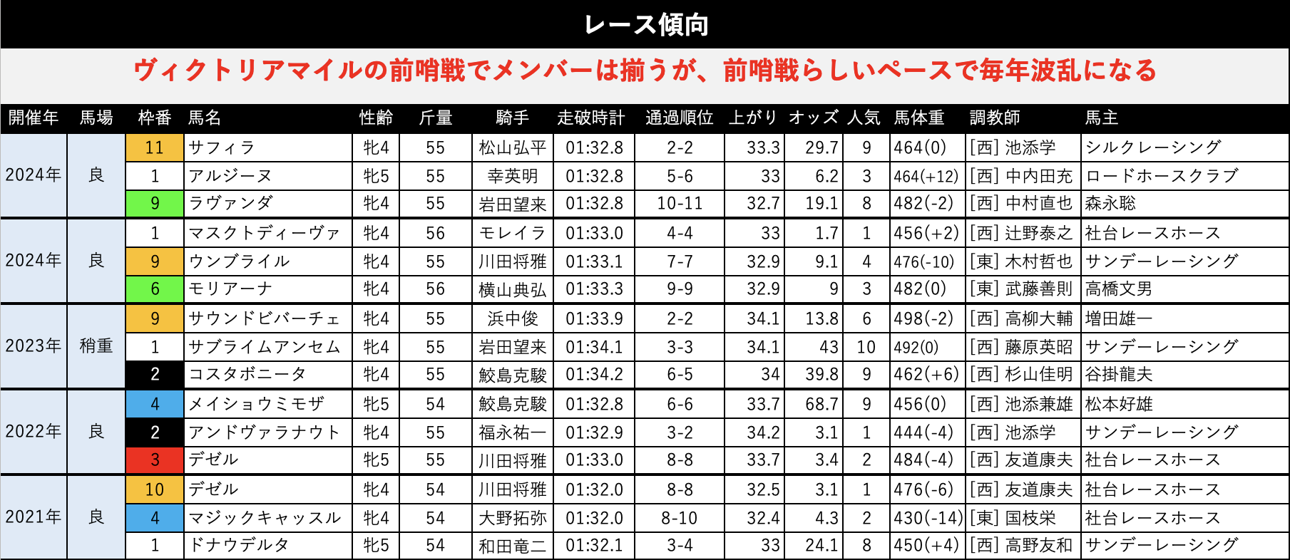 同週に同じコースで行われる桜花賞とは異なり、ヴィクトリアマイルの前哨戦になるのでほぼ間違いなくスローペースになる傾向。だいたい過去5年でも1秒は後傾のラップ構成になっています。