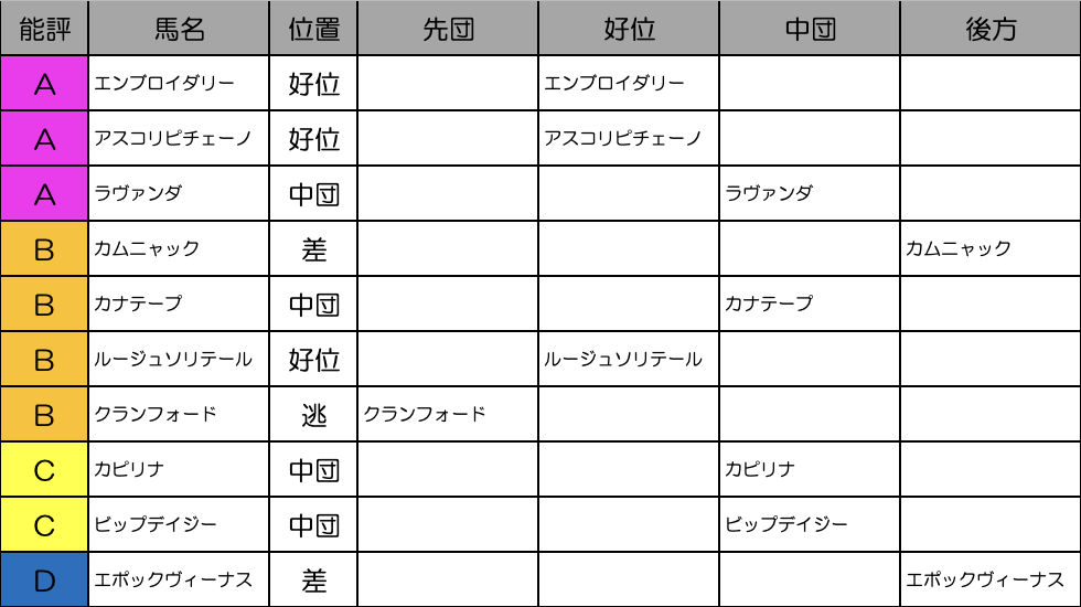少頭数で前に行きたい馬もほとんどいないメンバー構成。メンバーレベル自体は高いのですが、ほとんどの馬がヴィクトリアマイルの前哨戦。無理にここで結果を出しに行く馬も少ないでしょうし、クランフォードあたりが楽に逃げてのスローペースが濃厚か。