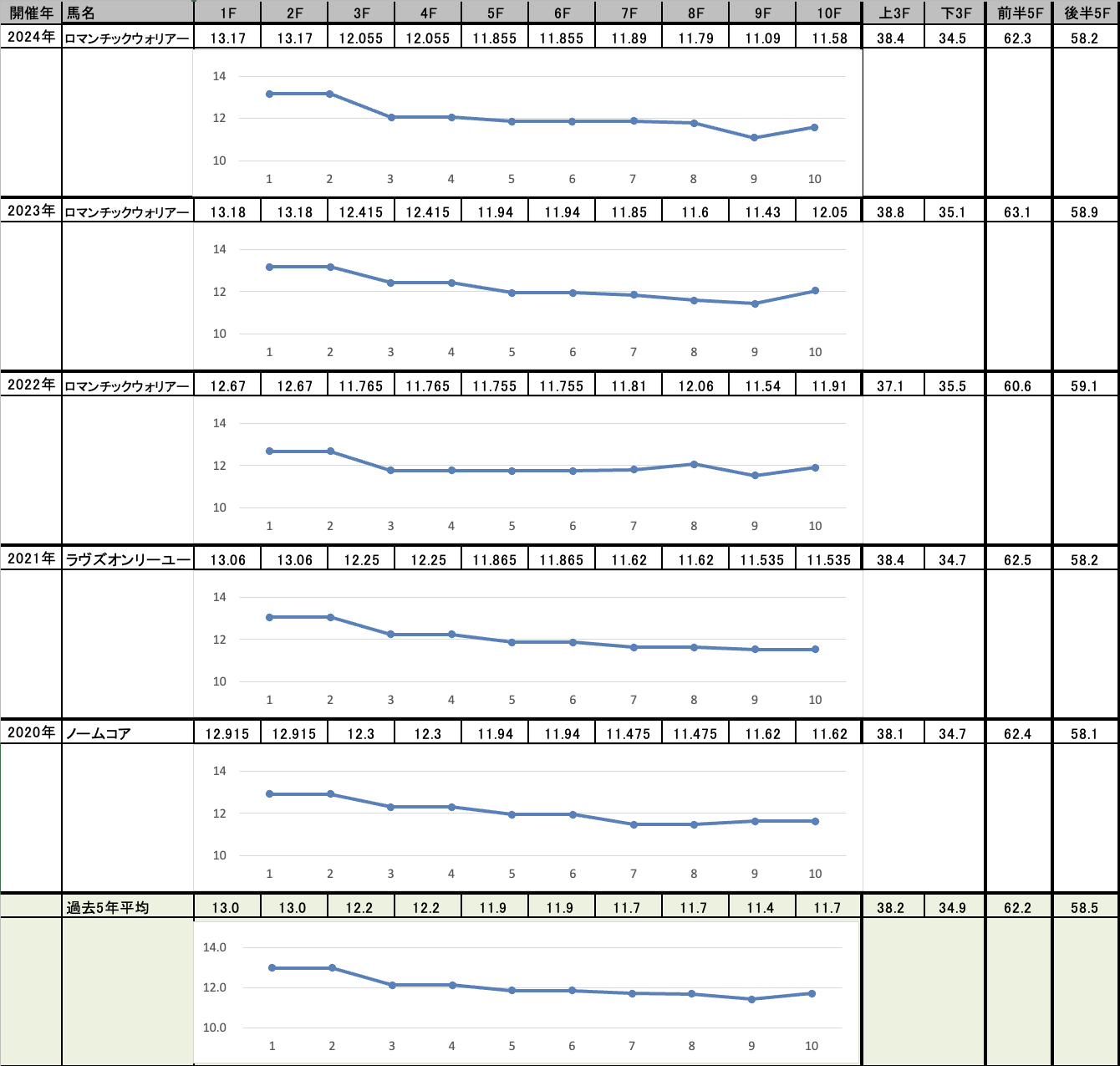 香港ジョッキークラブは全てのレースでラップタイムを公開していますが、日本のように1ハロンごとの記載はありません。数年前からラスト3ハロンのラップだけは1ハロンごとに個別に記載されるようになりましたが、それ以外は2ハロンずつの記載になっています。そんなわけでざっくり日本風のラップに直してみましたが、ラスト3ハロン以外は正確ではありません。それでも大まかなラップ傾向を把握するには十分でしょう。