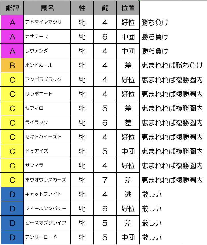 立ち回りセンス抜群でポカの少ない馬で使うごとに馬が強くなっている印象。昨年秋から戦ってきた相手はディマイザキッド、カナテープ、コスモフリーゲン、フェアエールングなど今年の夏重賞で上位に走っている馬ばかりですし、ヴィクトリアマイルも距離やペースが合わないながら0.3秒差に走れていれば強い。