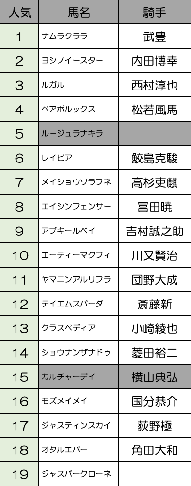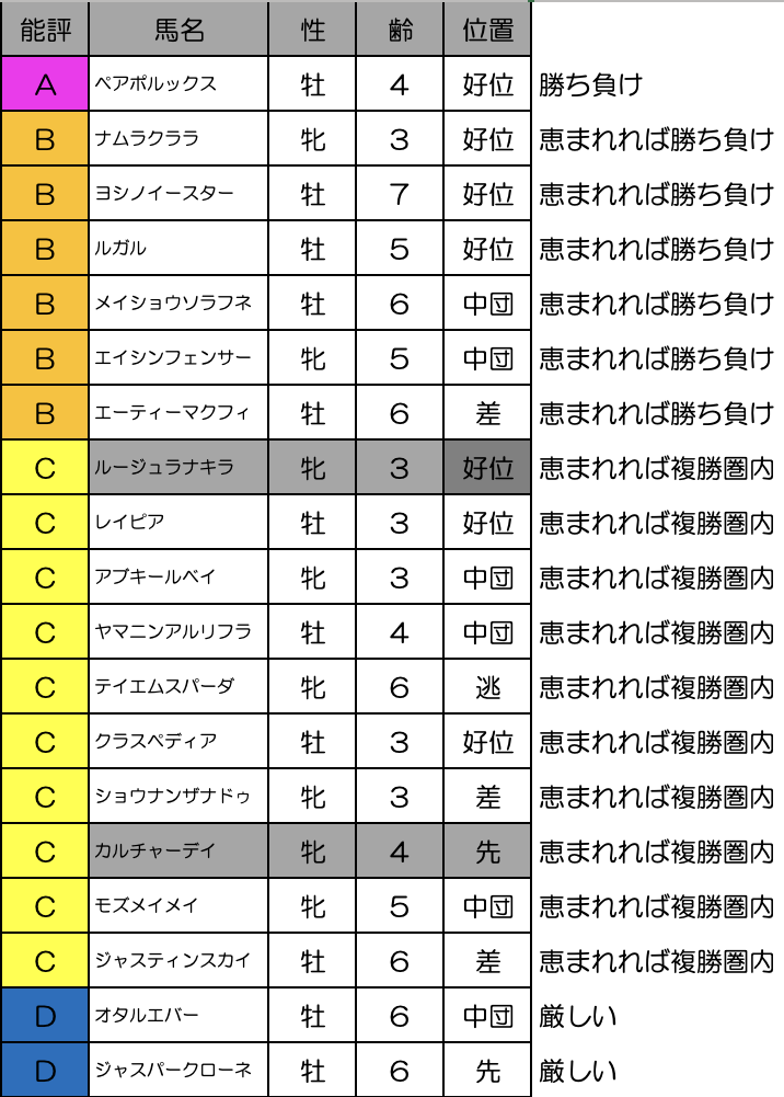 ここは枠次第でオッズがガラリと変わりそう。ルガルは近走成績と斤量で嫌われそう。枠次第ですがナムラクララやヨシノイースターが人気になりそうです。