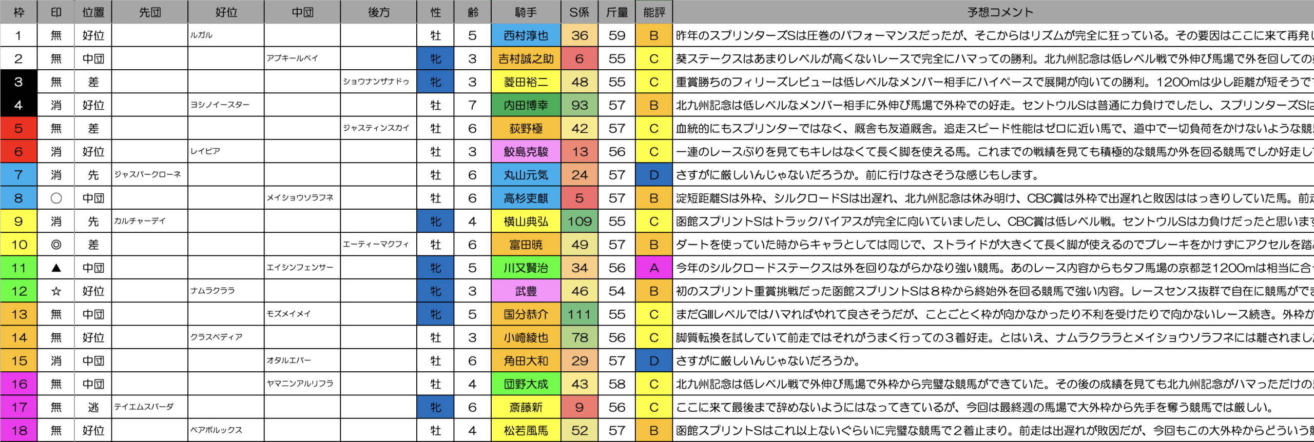 今回のメンバーの中では数少ない牡馬で前走スプリンターズSではなくて父が非SS系というデータに該当する馬。本命馬と枠が近いのも良さそうですし、ここは上位評価にしました。