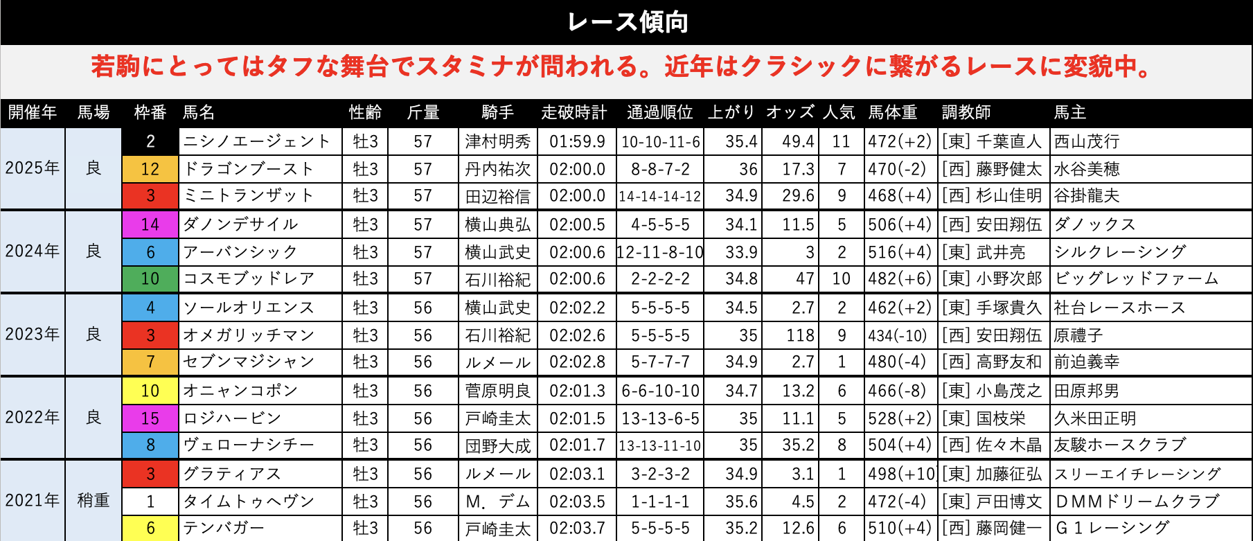 この時期の3歳馬はまだ体力が完成されていないので、急坂を2回登る中山芝2000mはスローペースでもタフな条件。冬時期の中山芝はかなりタフな馬場になりますし、そんな馬場での中山芝2000mとなるとスタミナが問われるレースになるのは当然でしょう。