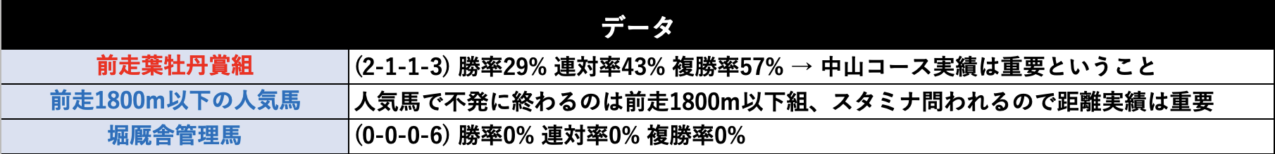 同じ中山コースで行われる葉牡丹賞組の成績が優秀。前走1800m以下の馬は人気で不発に終わることが多いレースです。