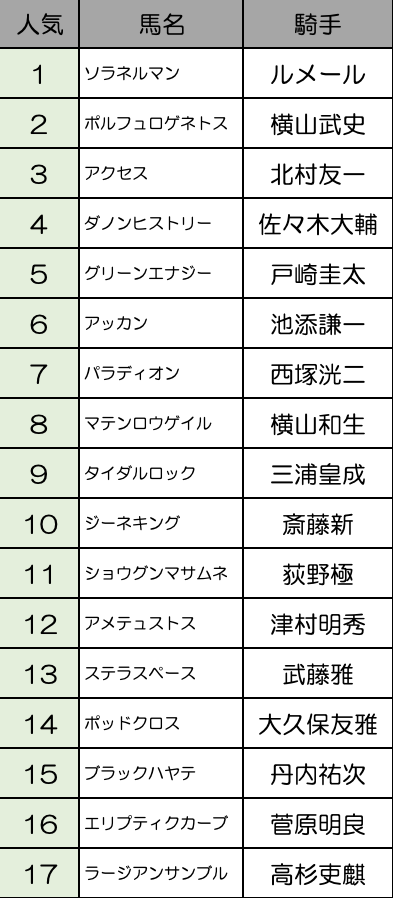 おそらく前走時計+前走ラップ+ルメールでソラネルマンが1番人気じゃないでしょうか。ポルフュロゲネトスも今のファンが大好きな前走どん詰まり組なので人気になるはずです。