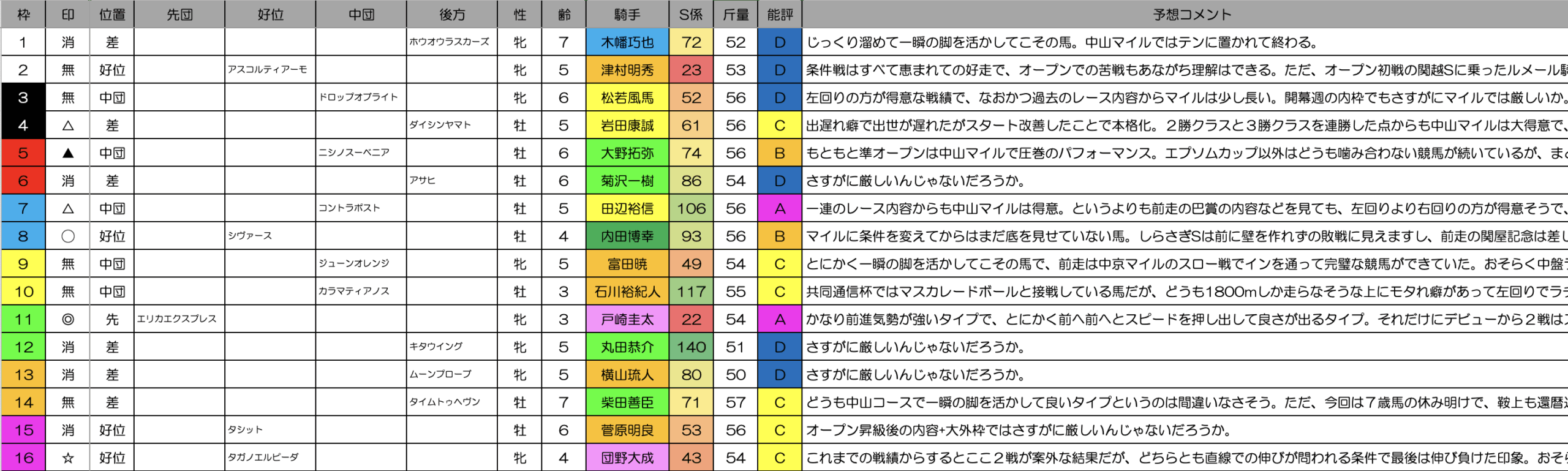 というポイントが唯一の手がかりのレースだったのですが、昨年は超高速馬場で逆に差しが決まる異質なレースに・・・この時期の中山は風の影響も受けやすいですし、土曜競馬なので馬場を見ることもできない本当に超難解なレースだと思います。