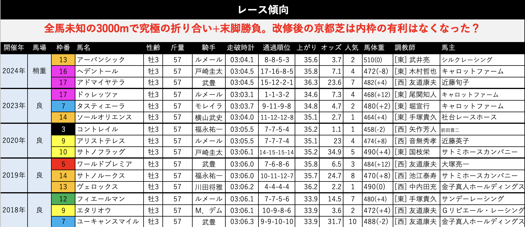 改修前の京都競馬場での菊花賞は、長距離適性+立ち回りが問われるレースで、明らかに内枠が有利なレースだった印象。