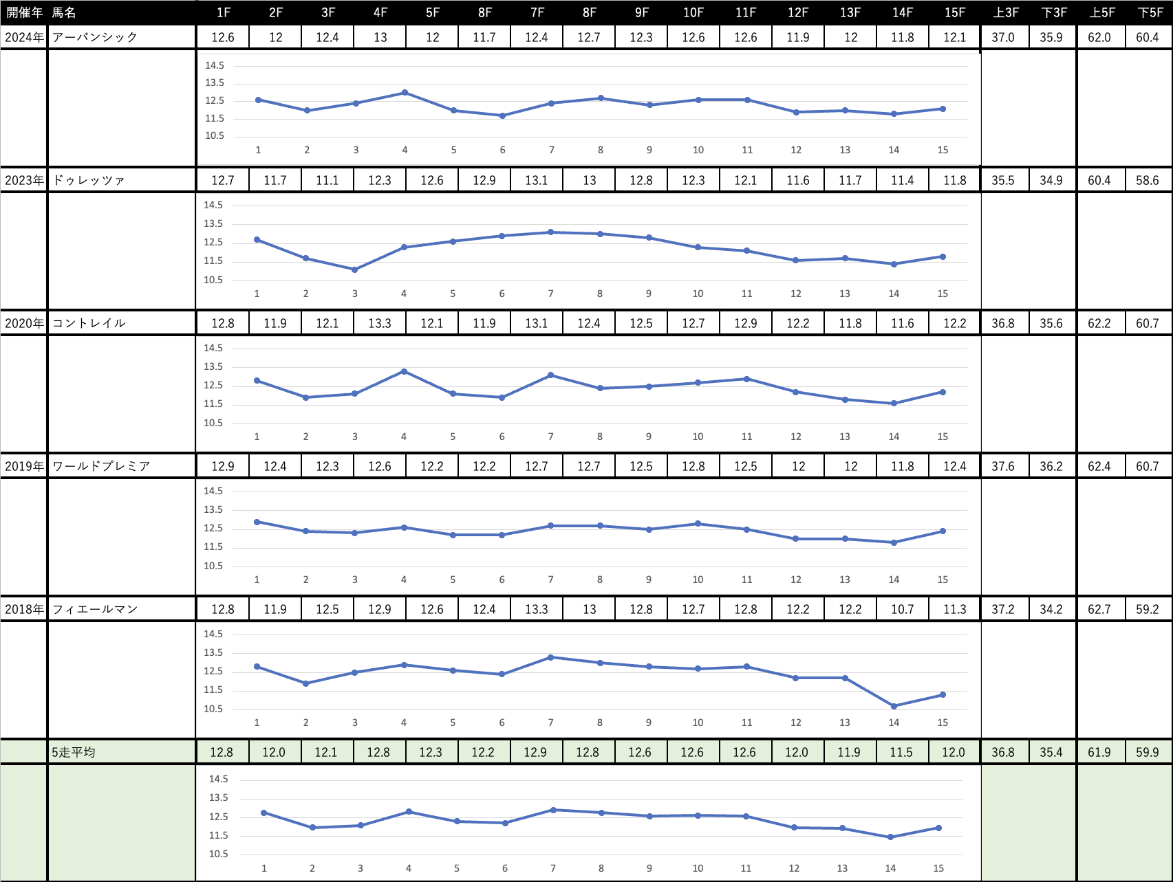 超長距離戦なのであんまり過去のレースラップを出してこうなるとは言いづらいところ。その年の先行馬の数などをしっかりと見て、展開やレースラップは考えていきたいところです。