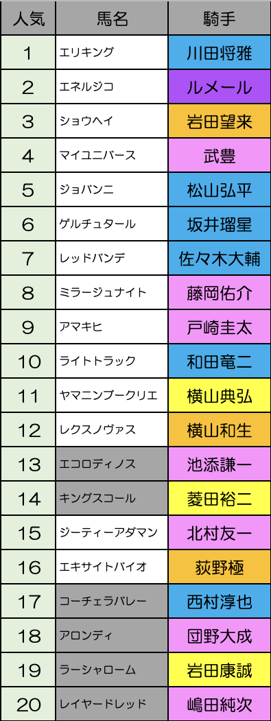 ここはエリキングが1番人気だと思いますが、ここ2年のルメール騎手の神がかり的な騎乗をみんな見ているのでエネルジコとそこまで差のないオッズになりそうです。