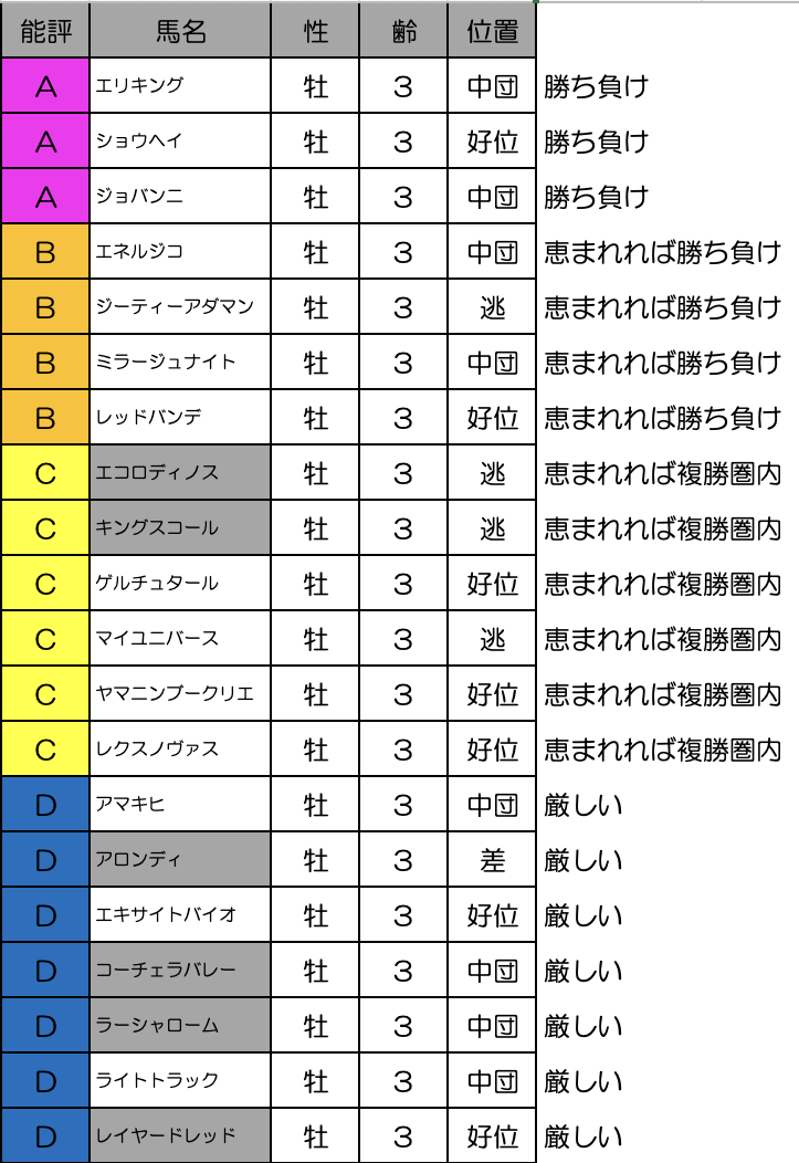 これを見れば縦比較で走破時計やレースラップがどれくらい優秀なのか把握できますし、予想の際にこれを見ればどの馬が強いレースを戦ってきたのかが一目瞭然です。