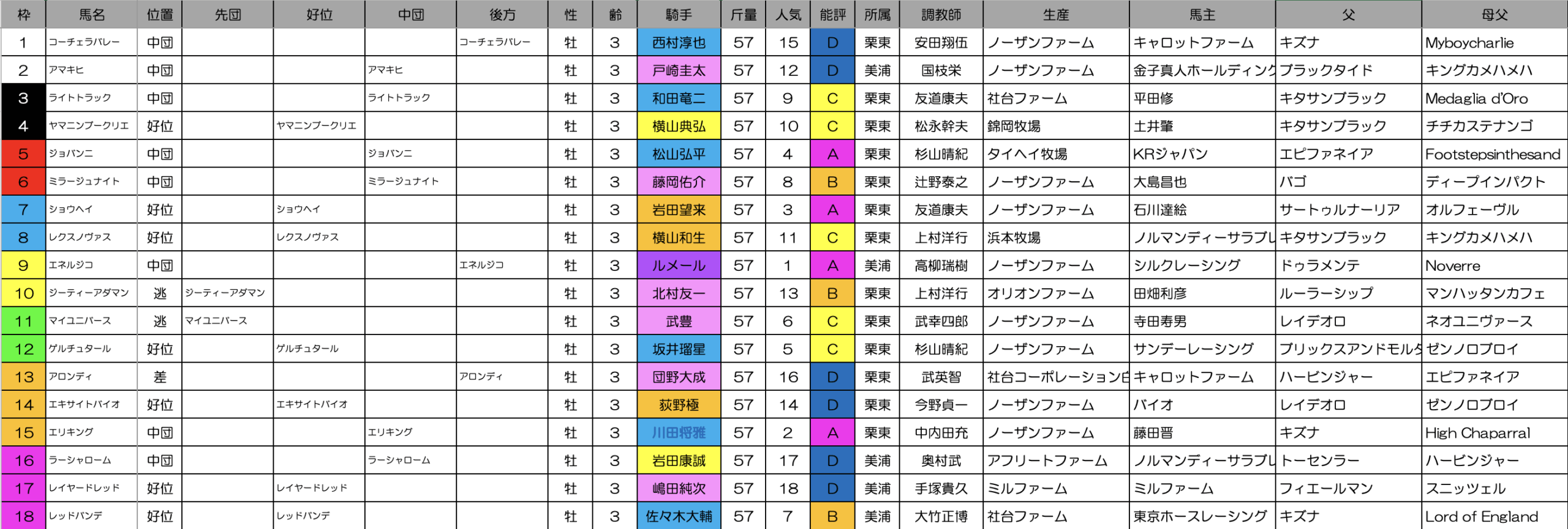 逃げ候補はジーティーアダマンとマイユニバースの2頭。おそらくジーティーアダマンが逃げると見ていますが、マイユニバースは陣営コメントからするとテンション次第で大逃げを打つ可能性もありそうです。
