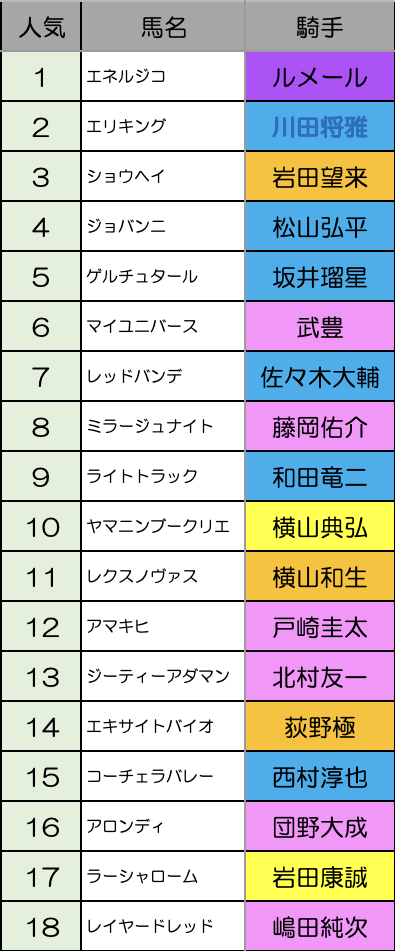 発表された枠順はこんな感じ。人気が予想されるエネルジコが中枠、エリキングが外枠。伏兵人気が想定されるジョバンニやショウヘイが内枠となりました。