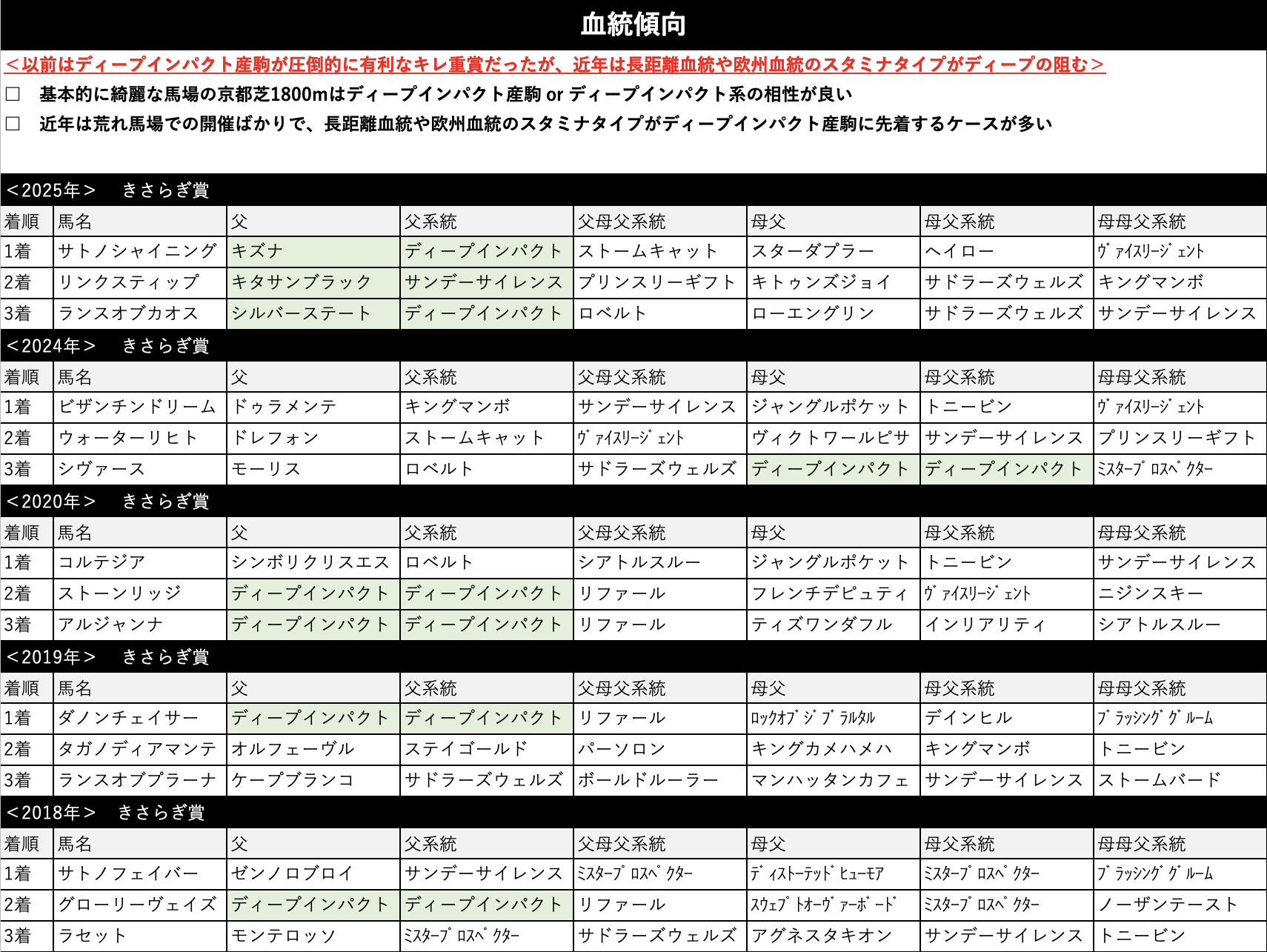 以前からきさらぎ賞はとにかくディープインパクト系の馬しか走らないレース。最近はタフ馬場すぎてディープインパクト系の馬をスタミナ血統の馬が倒す年も多いですが、昨年はディープインパクト系の馬が1、3着に好走しました。