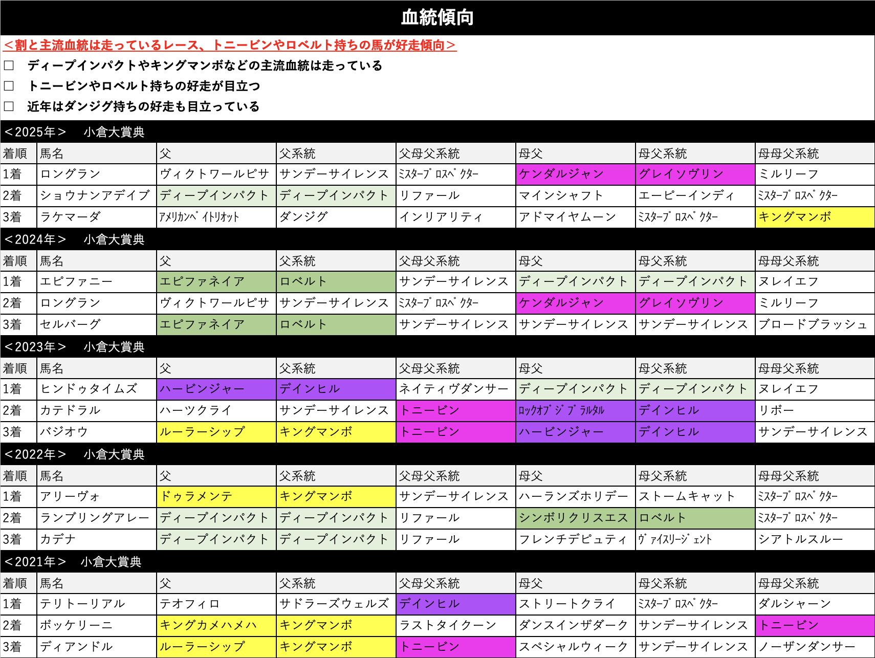 小回りコースではありますがディープインパクトやキングマンボなどの主流血統はよく走っています。トニービンやロベルトなどの欧州スタミナ血統持ちも有利ですね。