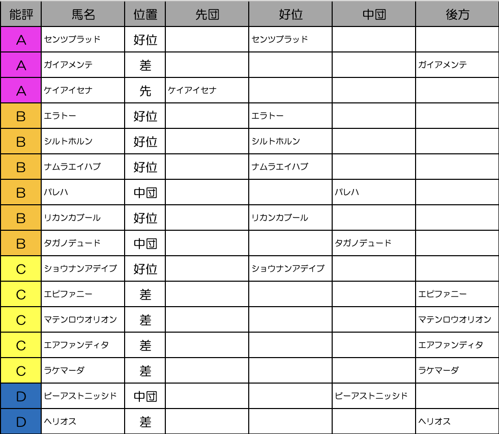 前走は距離不足で外枠でノーカウントとして良いはず。今回は条件的には良くなると思うのですが、仮にケイアイセナのような馬を評価するとなれば、真逆の脚質のこの馬を評価する必要はないか。