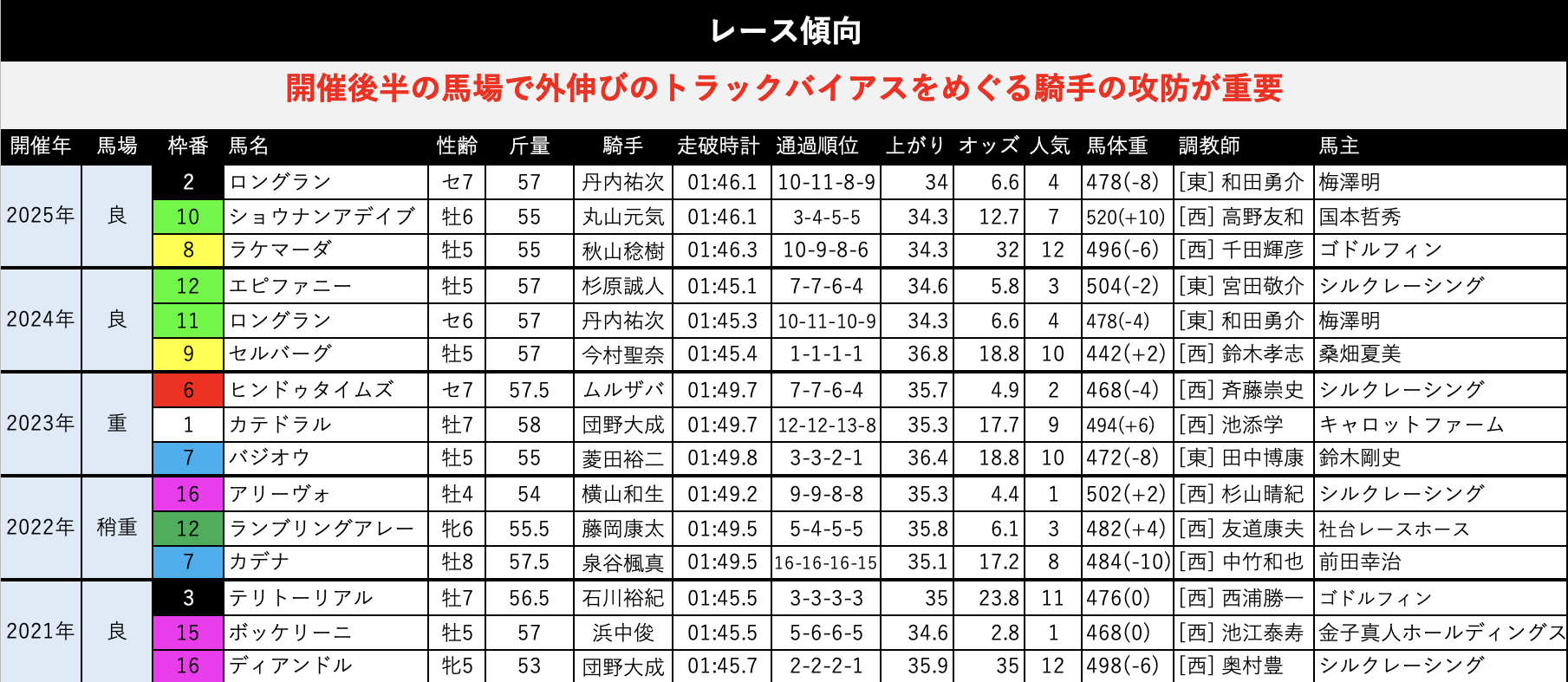 最終週で基本的には外差しが決まるレースだが、今年は例年ほど外差し馬場ではなく、前に行く馬もそこまでいない