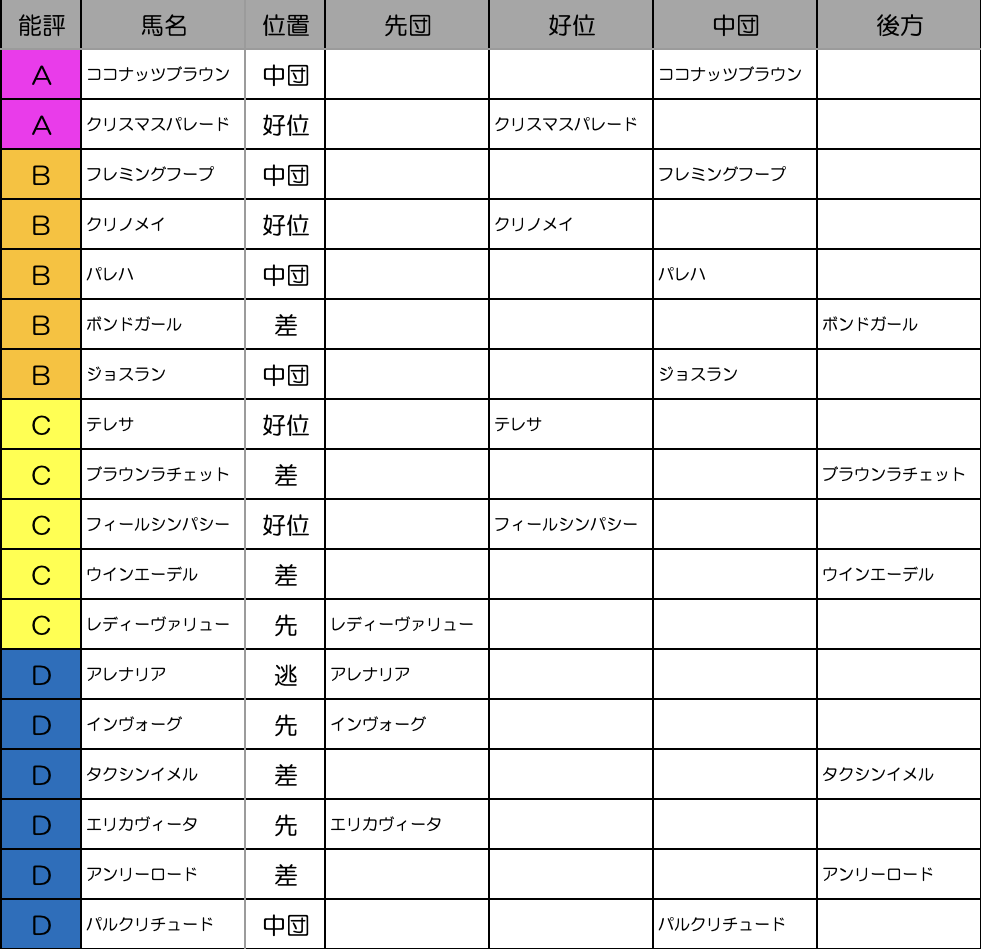 繰り上がりでアレナリアが出走。これによりアレナリアが主張してハナを奪う展開が濃厚。レディヴァリュー、インヴォーグ、エリカヴィータ、クリスマスパレードあたりも先行しそうで、前述の通りで風の影響もあれば差し馬が台頭してくると想定します。