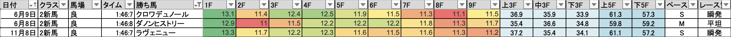 これを見れば縦比較で走破時計やレースラップがどれくらい優秀なのか把握できますし、予想の際にこれを見ればどの馬が強いレースを戦ってきたのかが一目瞭然です。