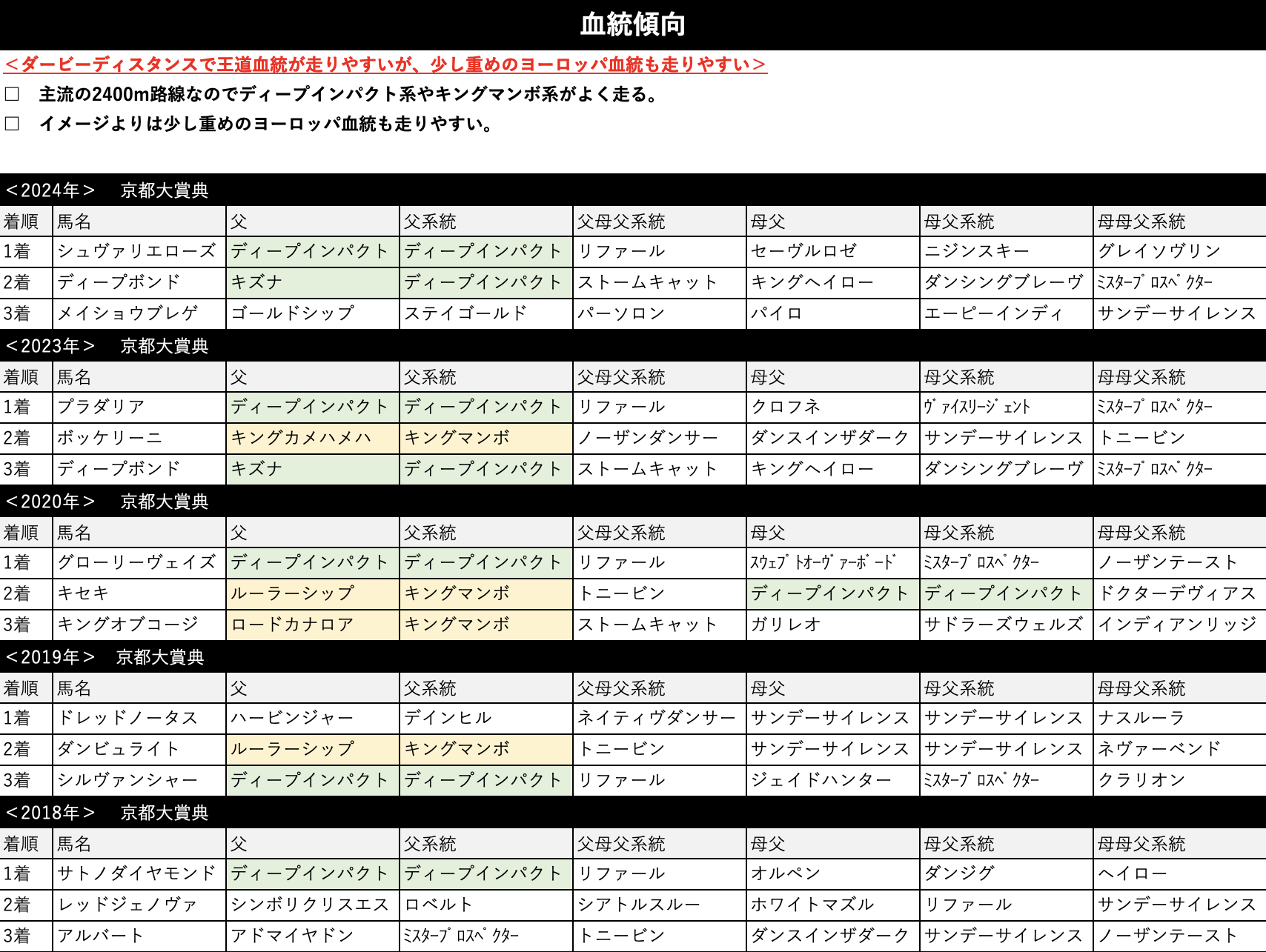 芝2400mのダービーディスタンスで行われるレースで、基本的には王道血統が走りやすい。前述のとおりで開幕週に行われるレースにしてはスタミナが問われるので、少し重めのヨーロッパ血統を持つ馬も走りやすい。