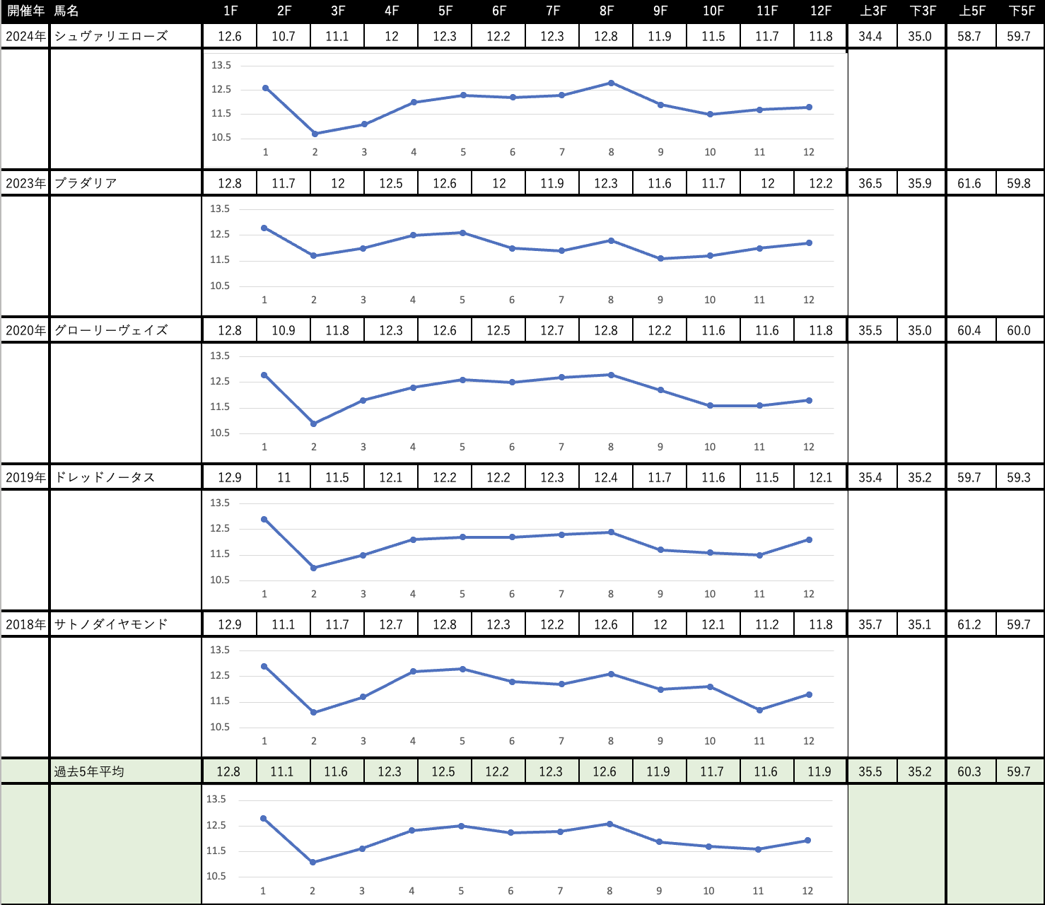 京都外回りコースを使用する長距離戦ということで前半ペースは速くならない傾向。過去5年平均で見ても4コーナーの坂の頂上からスパートが始まってラスト4ハロンの瞬発戦になるイメージのレースです。