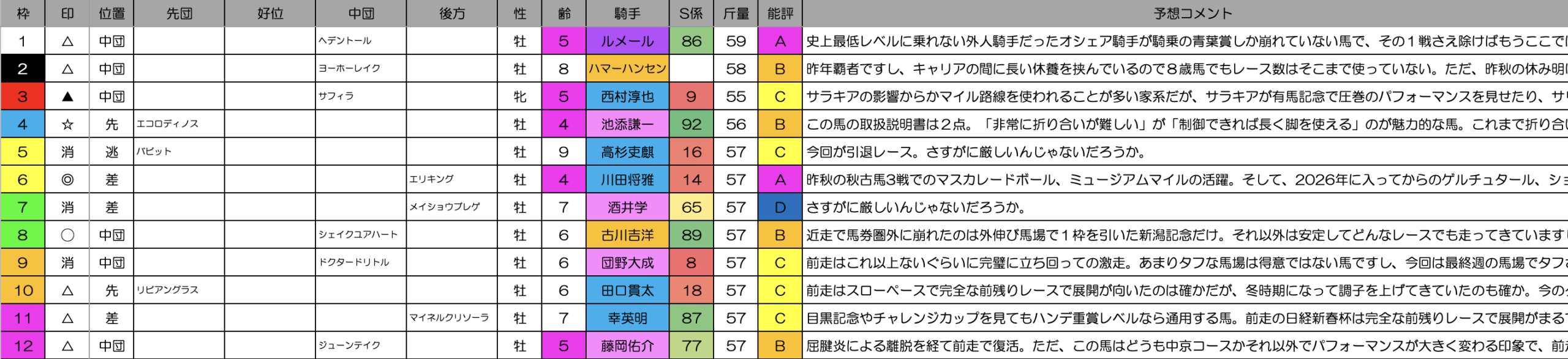 前走はスローペースで完全な前残りレースで展開が向いたのは確かだが、冬時期になって調子を上げてきていたのも確か。今のタフ馬場は合う馬ですし、再度前に行って恵まれる可能性もあるでしょう。