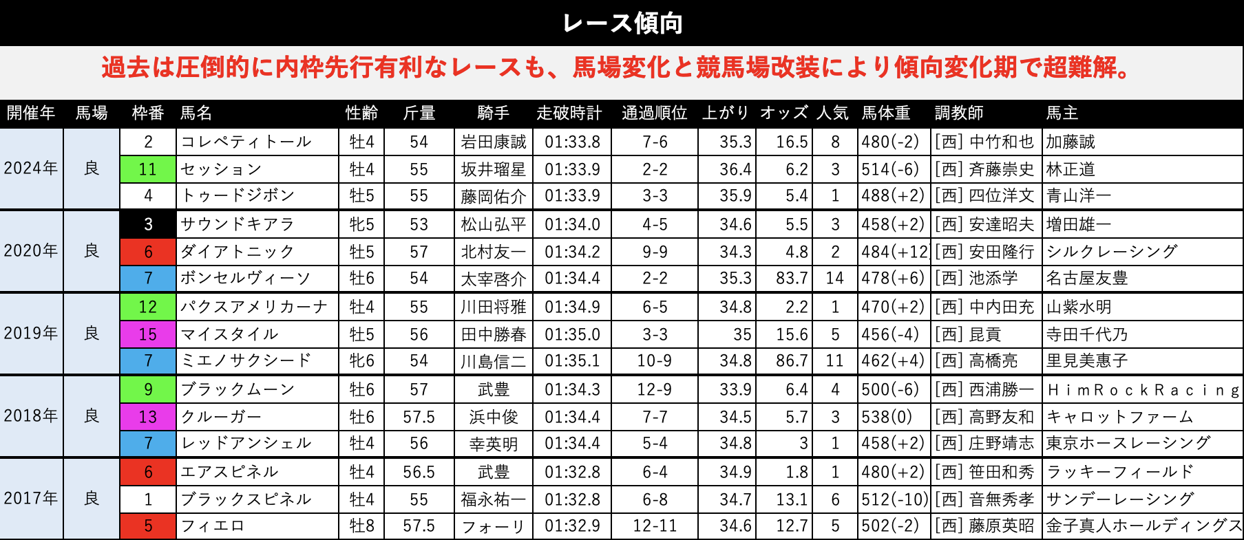2018年と2019年は外を通って差してきた馬で上位独占の結果。2020年は内枠決着になりましたが、かなりのスローペースで展開がレース結果に大きく影響した印象。そんな感じで徐々に外も差せる馬場に変化しつつあった中で、2020年から京都競馬場は改修に入り、改修後の2024年は完全な内枠決着になりました。