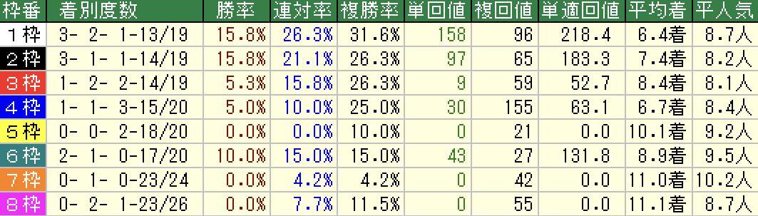 京都開催の過去10年の枠順別データを見ても、やはり圧倒的に内枠有利。ただ、近年のレース結果だけ見ると、そう単純ではなさそうで、、、