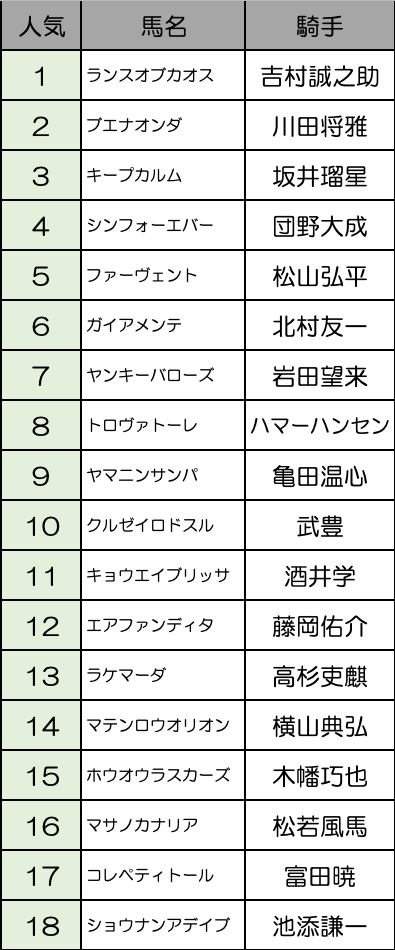 このレースは枠順次第でオッズが変わるのでなかなか難しいですが、ランスオブカオスが人気の中心じゃないでしょうか。ブエナオンダ、キープカルムあたりも人気になりそうですが、間違いなく楽逃げが叶いそうなシンフォーエバーが凄まじい穴人気になりそう。ファーヴェントももちろん人気になりそうです。