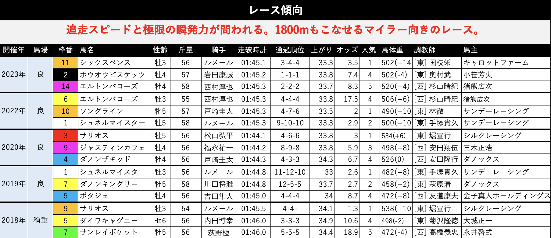 最近はそんなマイル寄りのレースになってきているということもあってか、2000m以上に実績があるような馬よりもマイルに実績があるような馬が活躍中。1800mも走れるマイラーを買うのがいいんじゃないでしょうか。
