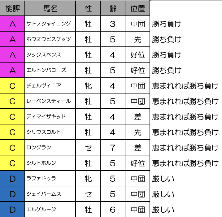 前走はしらさぎステークスで2着好走も、レースレベルが下がったから差し込んでこれた感じも。本当にこの馬への期待が高ければルメール騎手がいないこの週に使う感じもしませんし、あまり今の状態で期待はしたくないです。
