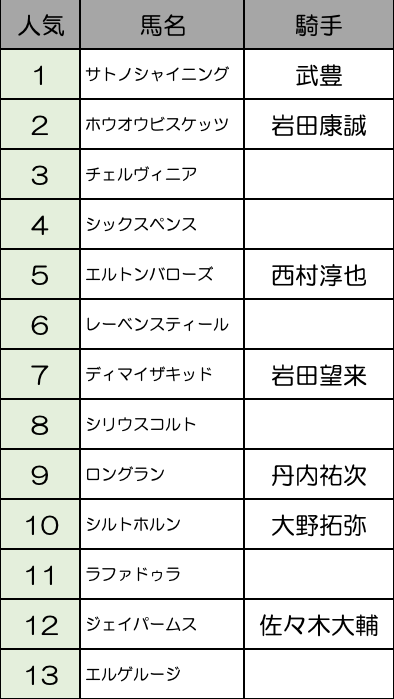 日本ダービーで4着のサトノシャイニングが1番人気と見て良さそう。ホウオウビスケッツ、チェルヴィニア、シックスペンスあたりが差のない2番人気以下になりそうです。