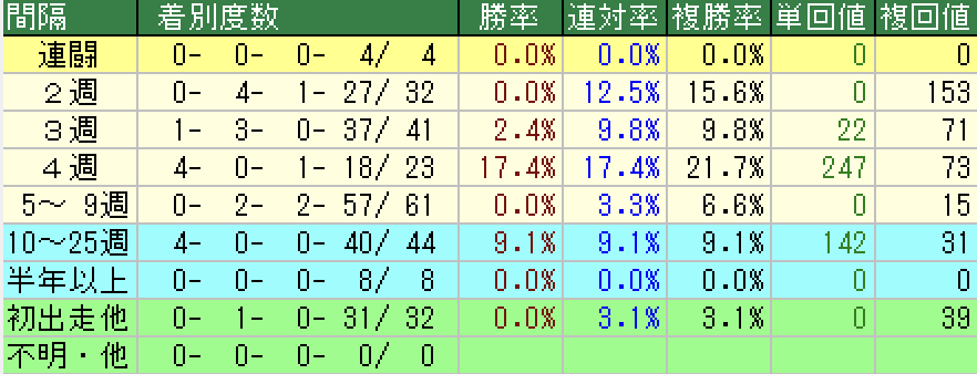 もう1点気になるのは中8周で間隔が空く点。羽月厩舎は詰めて使った方が結果が出る厩舎で、実際に間隔別データを見てもこんな感じ。