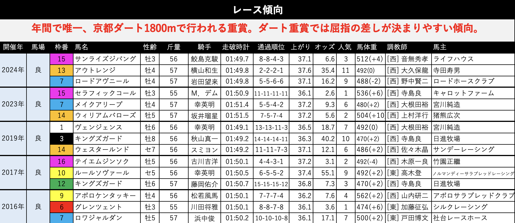 京都ダート1800mは上級戦でハイペースになりやすく、下り坂を活かして差し馬も勢いをつけやすいので差しが良く決まるんでしょう。直近の京都開催の5年のレース結果を見ても上がり1位の馬はほぼほぼパーフェクトな成績ですし、なかなか前有利なダート重賞でこれだけ上がり1位の馬が活躍しているレースもないでしょう。