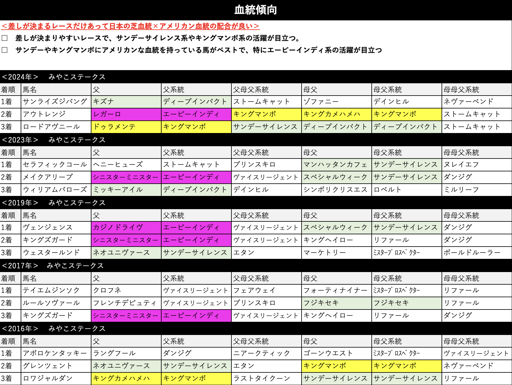 差しが決まりやすいレースなので父か母父がサンデーサイレンスorキングカメハメハの芝王道血統の馬がよく走っている傾向。そんな王道血統にアメリカンなダートのエッセンスを配合したような馬の相性がよく、特にエーピーインディ系は毎年のように好走しています。