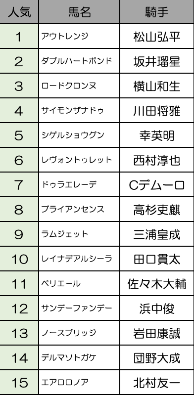 ミッキーファイトと接戦しているという点からもアウトレンジが1番人気濃厚。ほぼ崩れずのダブルハートボンドや、ロードクロンヌ、展開向きそうなサイモンザナドゥあたりも人気になるはずです。