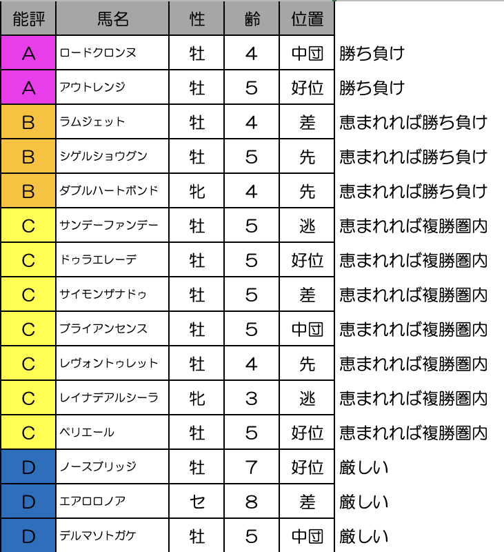 総合力とスタミナに優れたタイプなので良馬場のスタミナ勝負の方が信頼できたと思うが、おそらくダートでの才能がここでは最上位に見えるのでペースが上がって決着時計が速くなればその分でこの馬は時計を詰められそう。間違いなくハイペースで地力は問われるレースになると思いますし、ここは4歳秋になっての成長力も踏まえて期待してみたいところ。