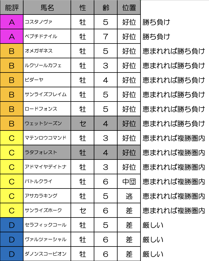 さすがにここはコスタノヴァが1番人気か。それに続いてオメガギネス、ルクソールカフェ、ペプチドナイルが人気になると思います。