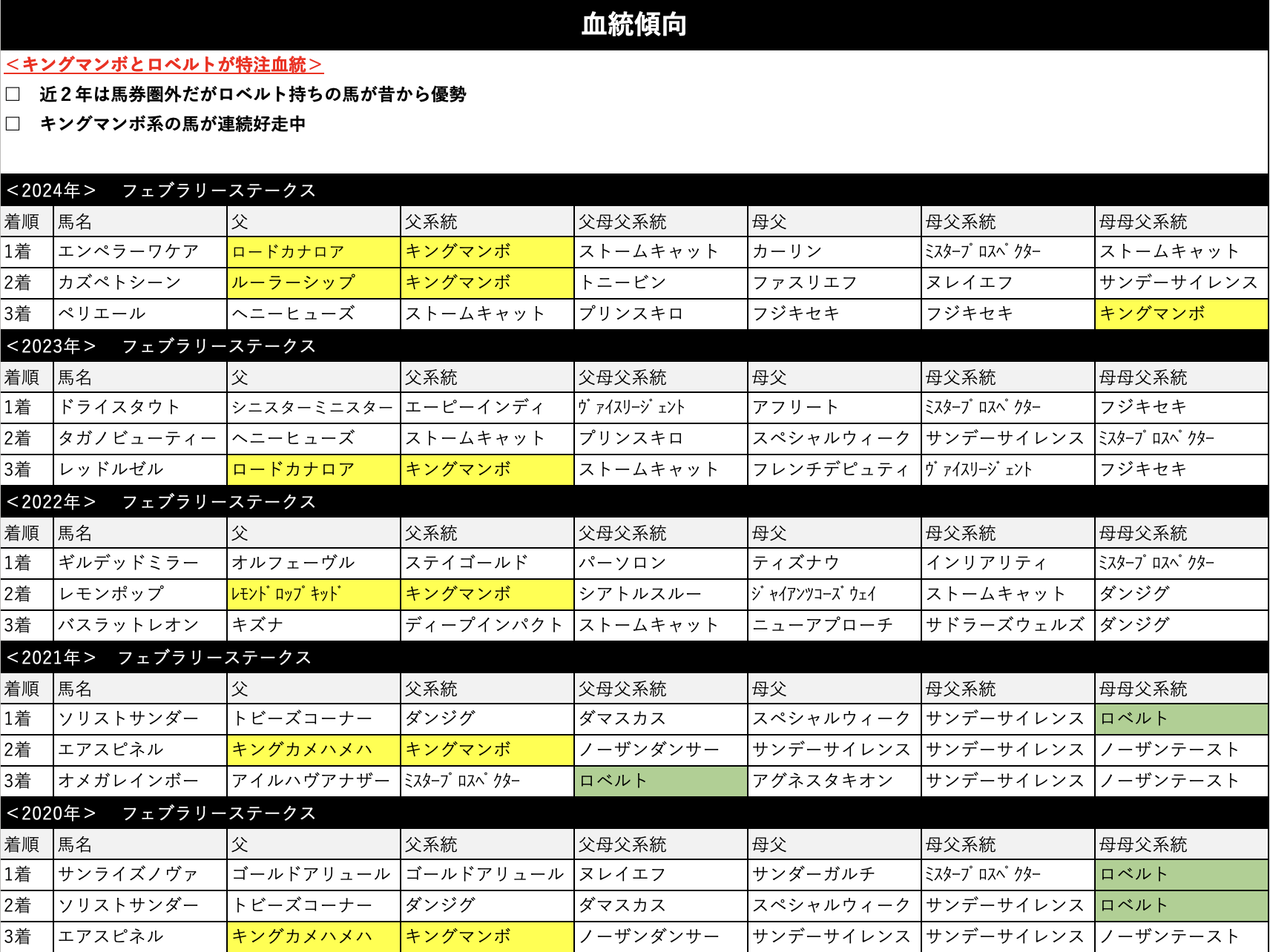 以前からロベルトの血を持った馬がよく走る傾向でしたが、最近は父がキングマンボ系の馬が毎年1頭は馬券に絡んでいます。