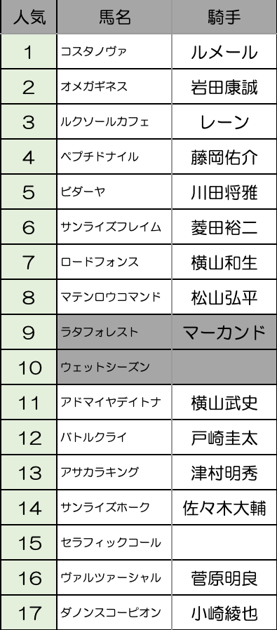 さすがにここはコスタノヴァが1番人気か。それに続いてオメガギネス、ルクソールカフェ、ペプチドナイルが人気になると思います。