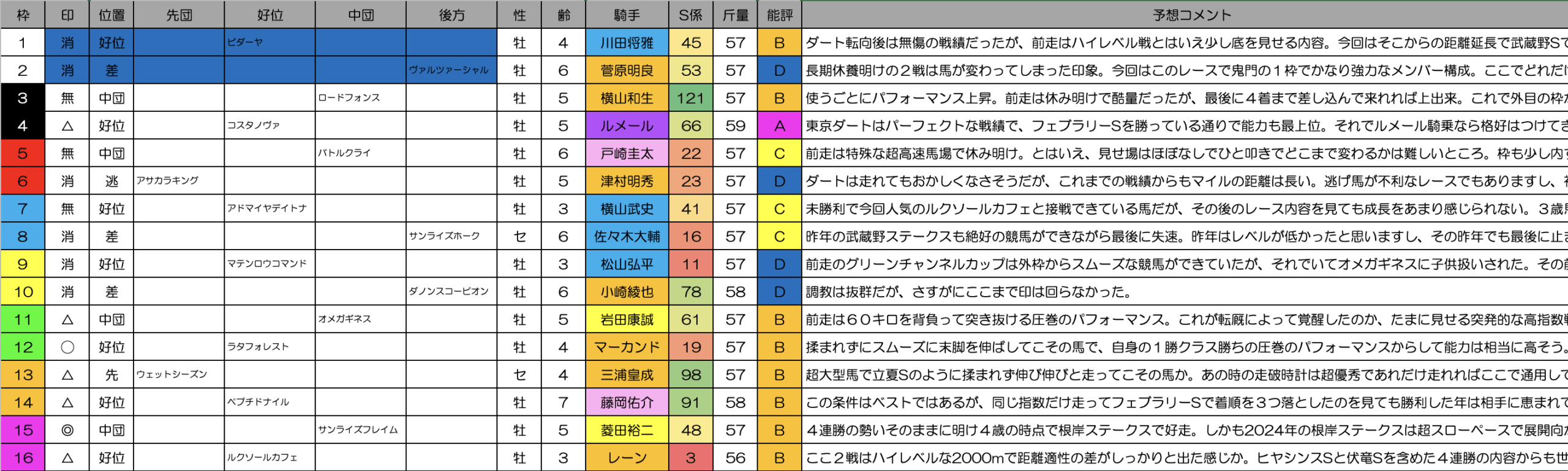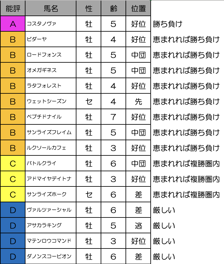 何が何でも逃げたいという馬はアサカラキングぐらいか。好位で進めたい馬が多いので、それらがどれくらい位置をとりにいくかで展開は変わりそう。少し広めのレンジで展開は考えておきたい。