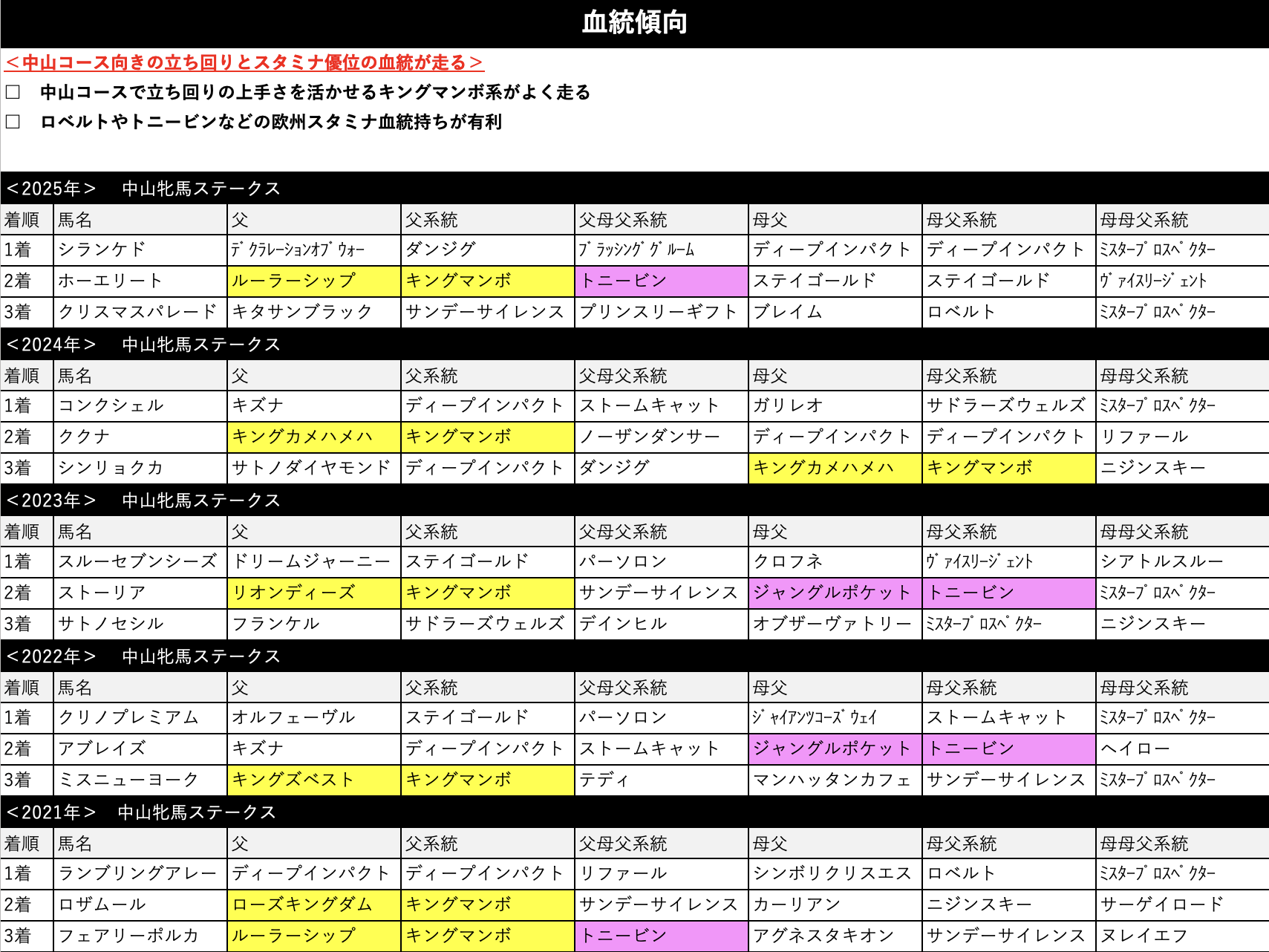 中山コース向きの立ち回りの上手さを活かせるキングマンボ系が優勢。それ以外となるとロベルトやトニービンあたりの欧州スタミナ血統持ちが有利となっています。
